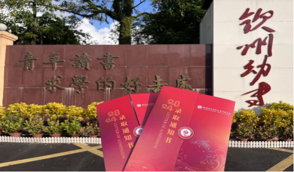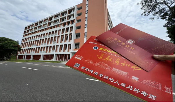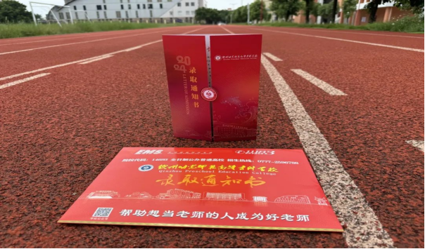 通知书每一处细节都体现出钦州幼专的元素。以中国红为基底,金色烫金点缀,艺术化的数字设计、创意图形和象征性元素巧妙融合,具有传统文化的美感,庄重而艺术。