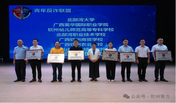 期间对北部湾大学、广西英华国际职业学院、钦州幼儿师范高等专科学校、北部湾职业技术学校、广西钦州商贸学校、广西钦州农业学校6个单位颁发青年反诈联盟牌匾。