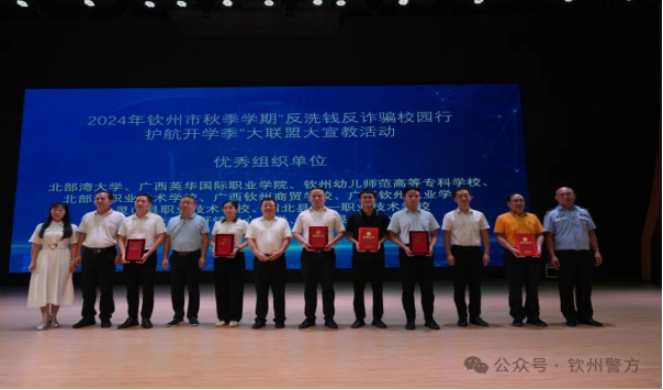 对北部湾大学、广西英华国际职业学院、钦州幼儿师范高等专科学校、北部湾职业技术学校、广西钦州商贸学校、广西钦州农业学校、灵山县职业技术学校、浦北县第一职业技术学校等8个单位颁发反洗钱反诈骗校园行系列主题活动优秀组织单位证书。