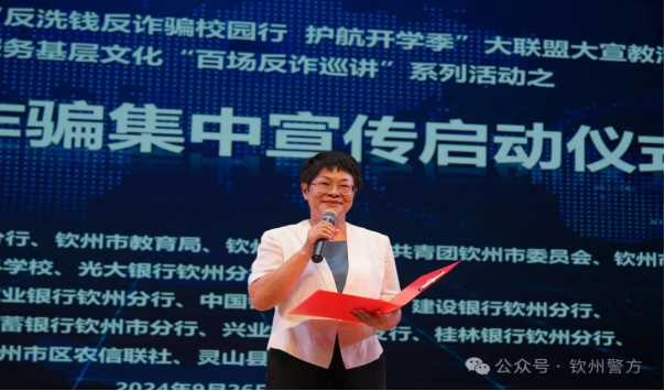 钦州市教育局党组成员、副局长、钦州幼儿师范高等专科学校党委书记田茂群、人民银行钦州市分行党委委员、副行长罗道芳、团市委副书记李福强、市人民政府打击治理电信网络诈骗工作协调机制办公室常务副主任、市公安局刑事侦查支队支队长苏文等领导出席并共同启动“反洗钱反诈骗校园行 护航开学季”活动。
