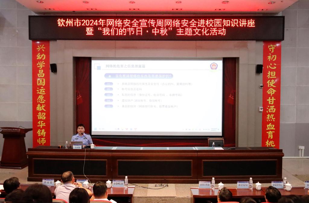 为积极响应国家网络安全宣传周号召,提升师生在识骗防骗、网络安全等方面的意识,深入宣传贯彻《网络安全法》及相关配套法规,进一步增强我校师生的网络安全防范意识和防护能力。9月13日,钦州市2024年网络安全宣传周网络安全进校园知识主题活动在我校举行,活动由钦州市委宣传部、市委网信办、市教育局主办,团市委、市公安局网安支队、市反诈中心协办。主题活动邀请了钦州市公安局网络安全保卫支队一级警司、警务技术四级主管韦可强作题为《筑牢网络安全防线,共筑清朗校园网络》的网络安全知识讲座。