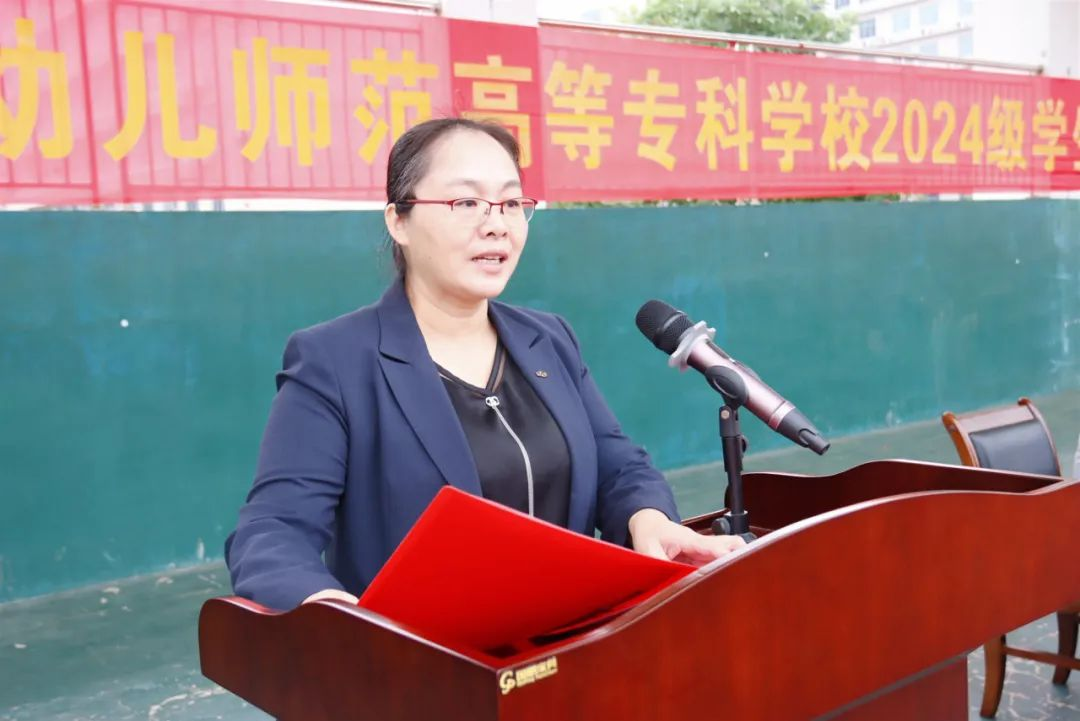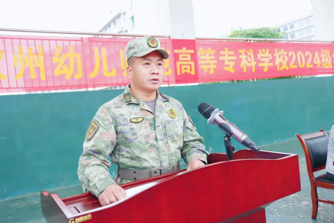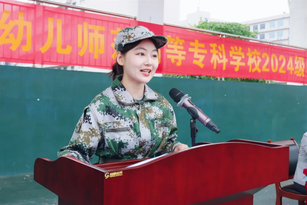 学前教育专业2024(10)班李雨倩同学代表军训学员作表态发言。她承诺,将会以一名“军人”的标准严格要求自己,尊重教官、服从指挥,团结协作、共同进步,坚持不懈、勇于挑战,严守纪律,在军训中乘风破浪,收获成长的果实。