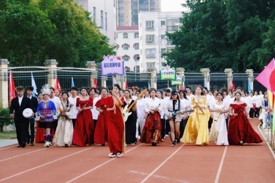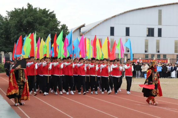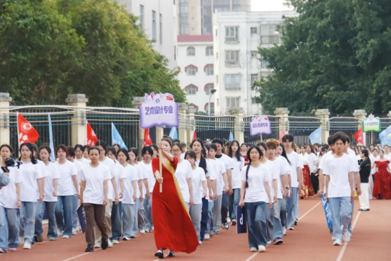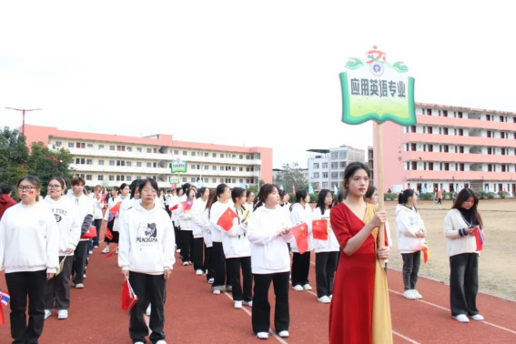随着运动员进行曲响起,国旗队、彩旗队、鲜花队等各方块队以及各二级学院专业代表方块队踏着整齐的步伐入场。