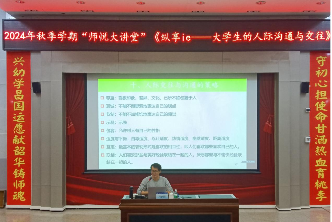 程族桁教授的讲座以“纵享“ie——大学生的人际沟通与交往”为主题。他结合自身丰富的教学及心理咨询经验,通过生动的例子阐释了影响人际关系的12个要素,解读了大学生人际交往的现状和常见问题,传授了及时赞美、提高共情、非暴力沟通、保持适宜人际距离等人际沟通的实用技巧。