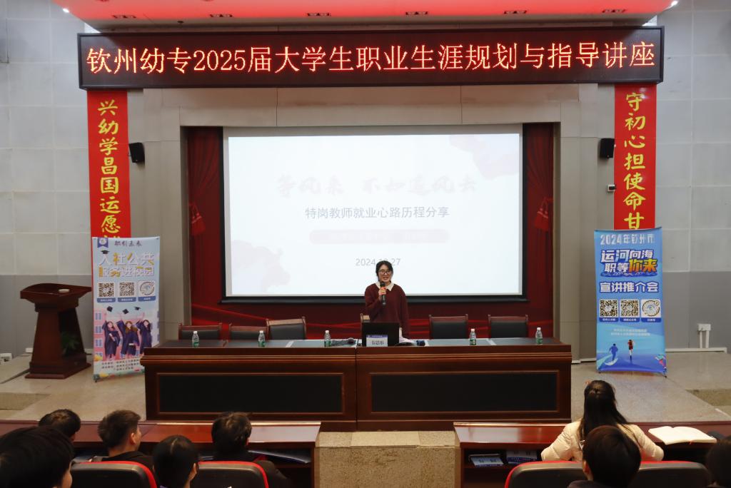 讲座中,特岗教师代表韦思彤分享了她的就业心路历程。她与同学们重温了多彩多姿的校园生活,讲述了与本科组老师共同研讨公开课的教研活动、带领学生参与节日文艺活动和校运动会比赛、以及家访特殊学生的难忘经历,这些都深深打动了在场的每一位同学。她鼓励有志于教育行业的同学们积极参与职业规划大赛,通过比赛提高个人的就业竞争力。