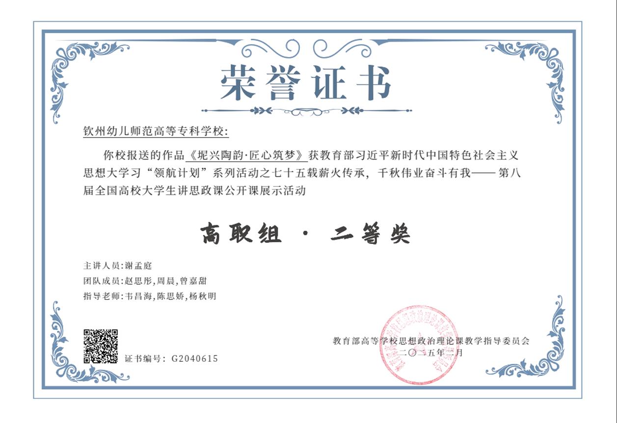 在第八届全国高校大学生讲思政课公开课展示活动中,由我校马克思主义学院教师韦昌海、陈思娇、杨秋明指导,学生团队成员谢孟庭、赵思彤、周晨、曾嘉甜共同完成的作品《坭兴陶韵·匠心筑梦》荣获高职组二等奖。