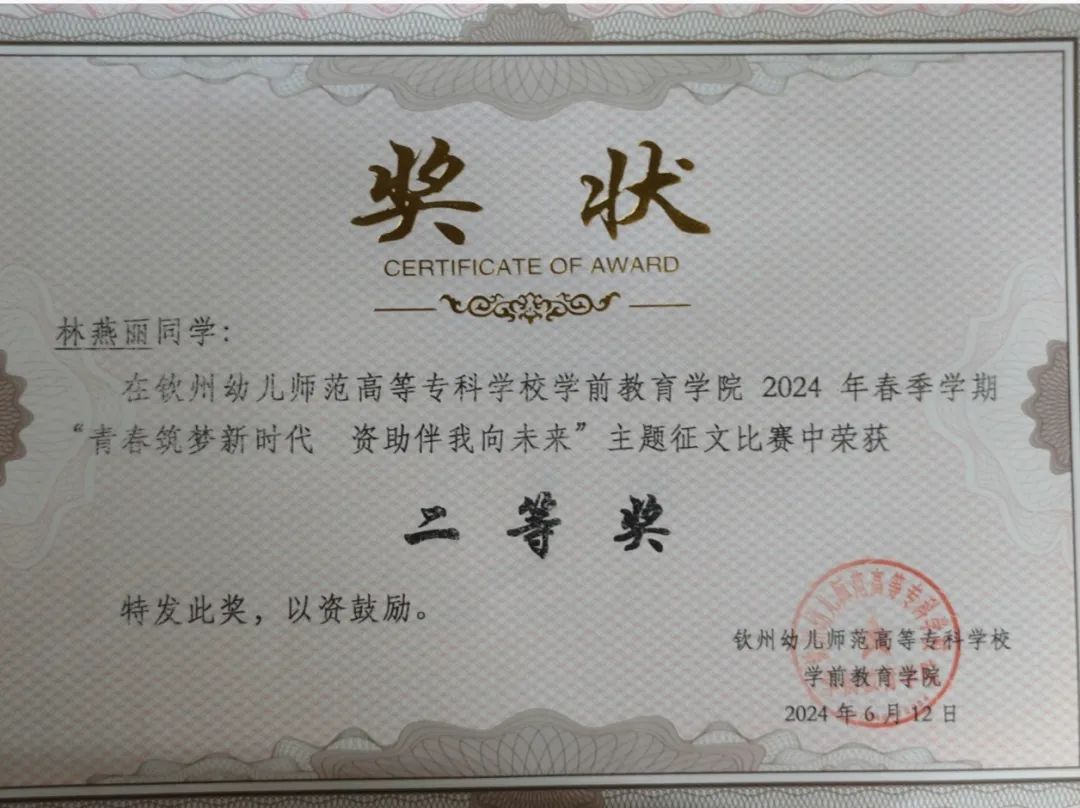 林燕丽,女,共青团员,钦州幼儿师范高等专科学校学前教育学院2023级22班学生。现任班级学习委员,在大学期间参加校内勤工助学,担任音乐实训楼的教学教辅助理一职,曾获得2023-2024学年院级“优秀学生干部”,学习成绩优异,曾获得2023~2024学年国家励志奖学金?;够竦霉г涸┗反醋髌氛固氐冉?、职业规划大赛三等奖、主题征文比赛二等奖、幼儿舞蹈基本功二等奖、儿歌表演唱三等奖等多项荣誉,展现了全面发展的优秀素养。
