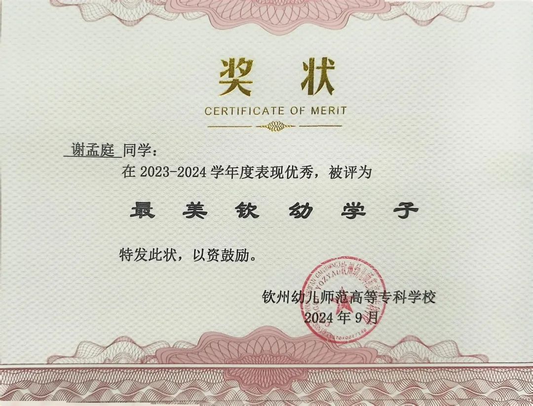 谢孟庭,女,共青团员,钦州幼儿师范高等专科学校学前教育学院学生。在校期间,她以优异的表现和全面的素养脱颖而出,先后担任班级副班长、钦州幼专2024年“青年马克思主义者培养工程”培训班班长、校团委学生副书记、校园之声广播站站长、礼仪社组织部部长等职务。凭借突出的领导力与奉献精神,荣获校级“优秀学生干部”“校园文明建设个人”“三好学生”“最美钦幼学子”等多项荣誉称号。在学业上始终保持优异成绩,荣获国家奖学金;曾代表学校参加多项区级比赛并屡创佳绩,包括全国高校大学生讲思政课公开课展示活动二等奖、广西高校大学生朗诵大赛决赛高职高专院校组三等奖、广西职业院校技能大赛幼儿教育技能赛项银奖等,展现了新时代青年学子的风采。