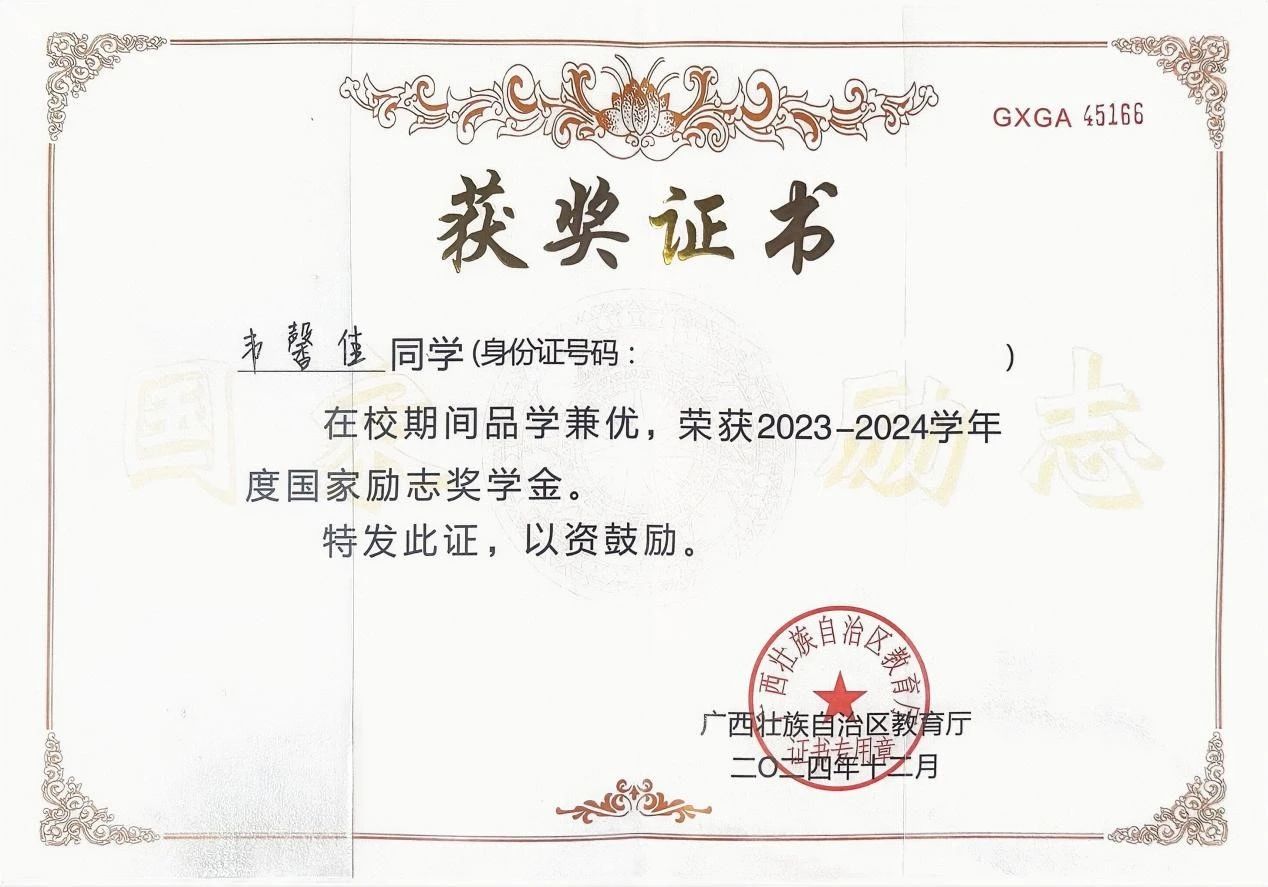 本期让我们走近国家励志奖学金获得者——韦馨佳同学,感受她身上的榜样力量!