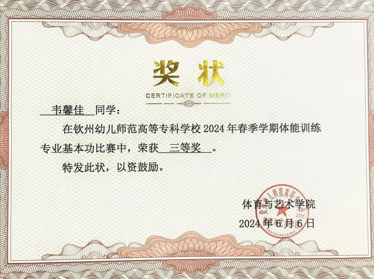 韦馨佳,共青团员,体育与艺术学院体能训练专业23级01班学生。现任班级班长,在大学期间曾荣获2023-2024学年度国家励志奖学金、校级一等奖学金、三好学生、优秀学生干部、最美钦幼学子、校园文明先进个人、“弘扬宪法精神 建设法治校园”手抄报二等奖、军训先进个人、专业基本功大赛女子组三等奖等荣誉。