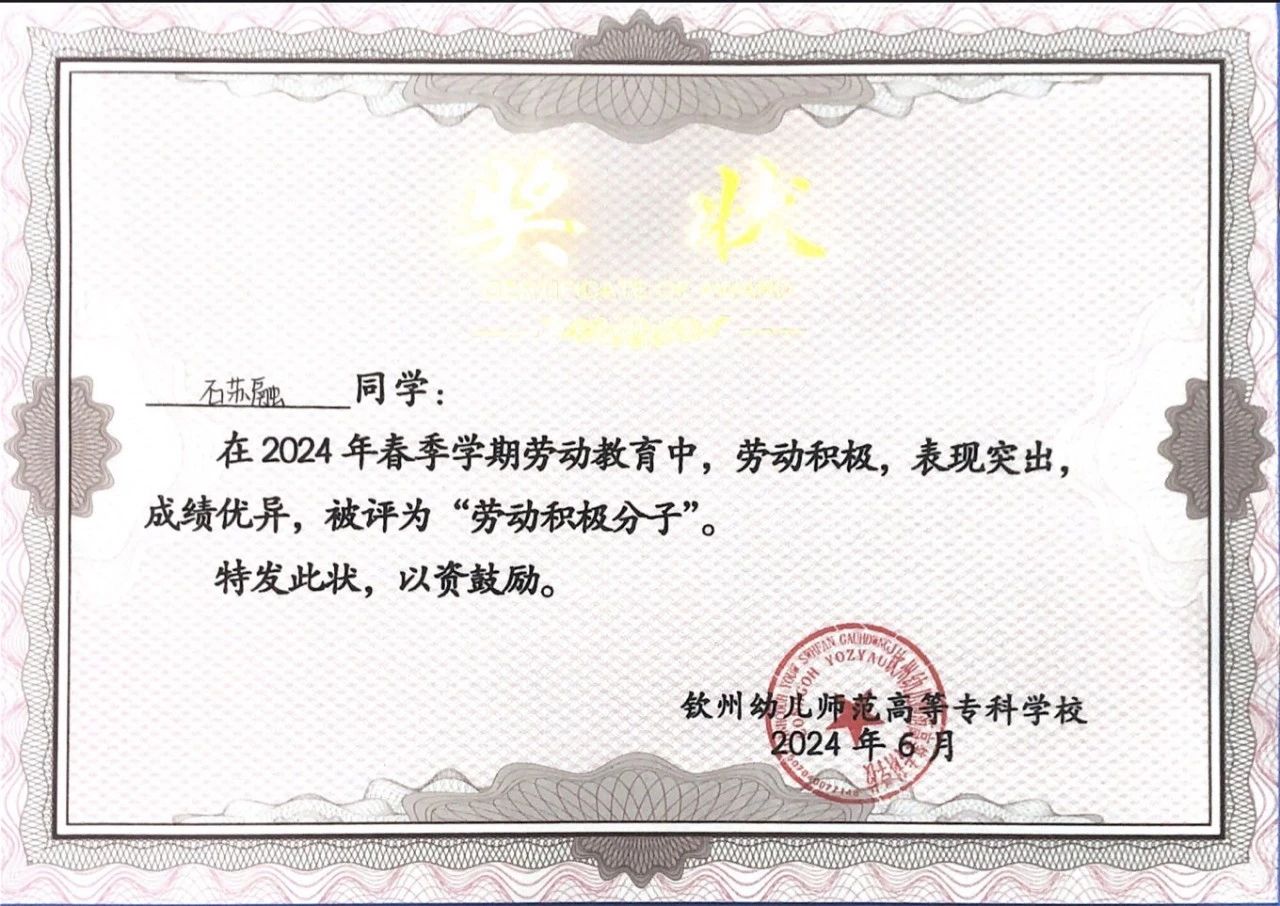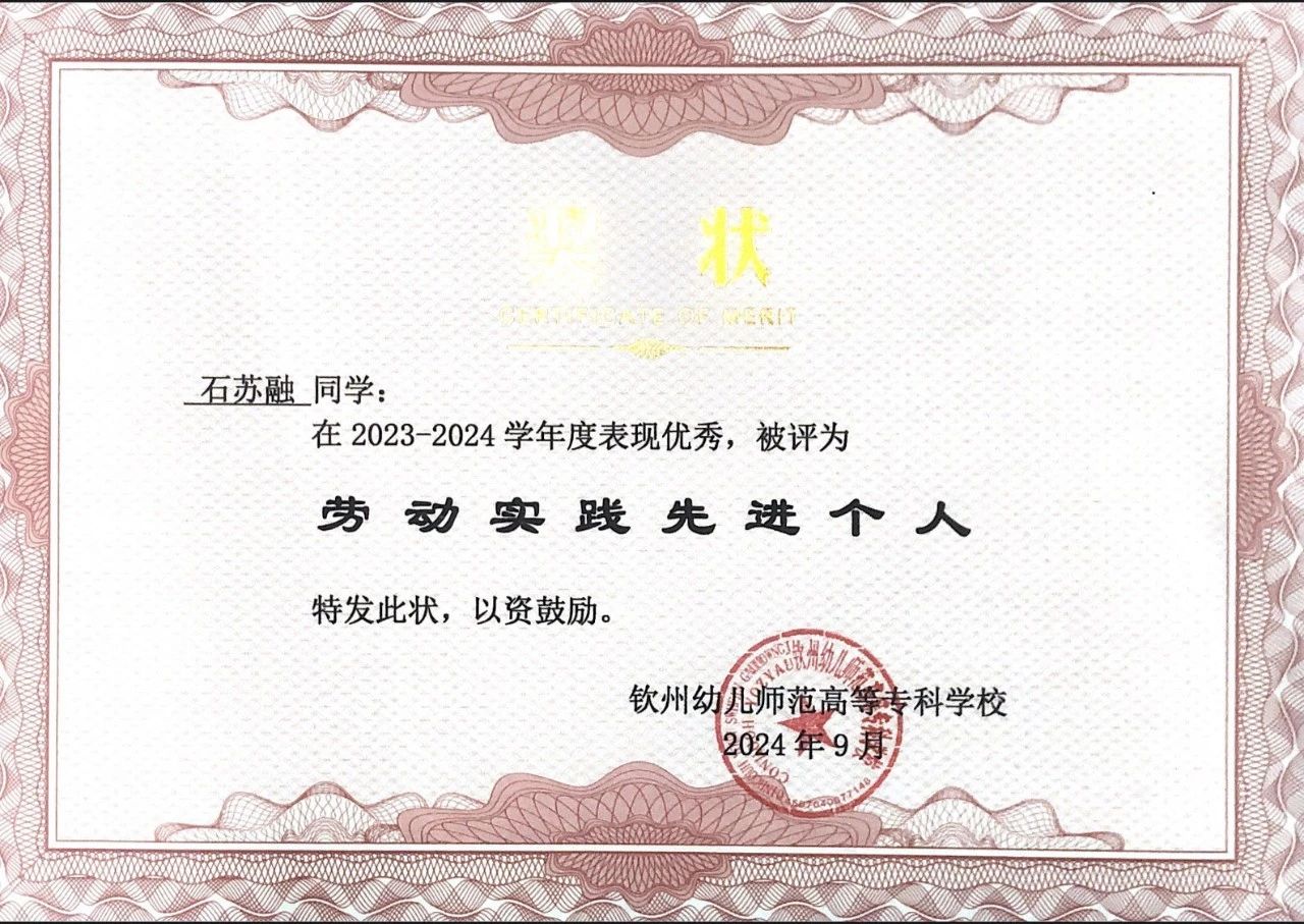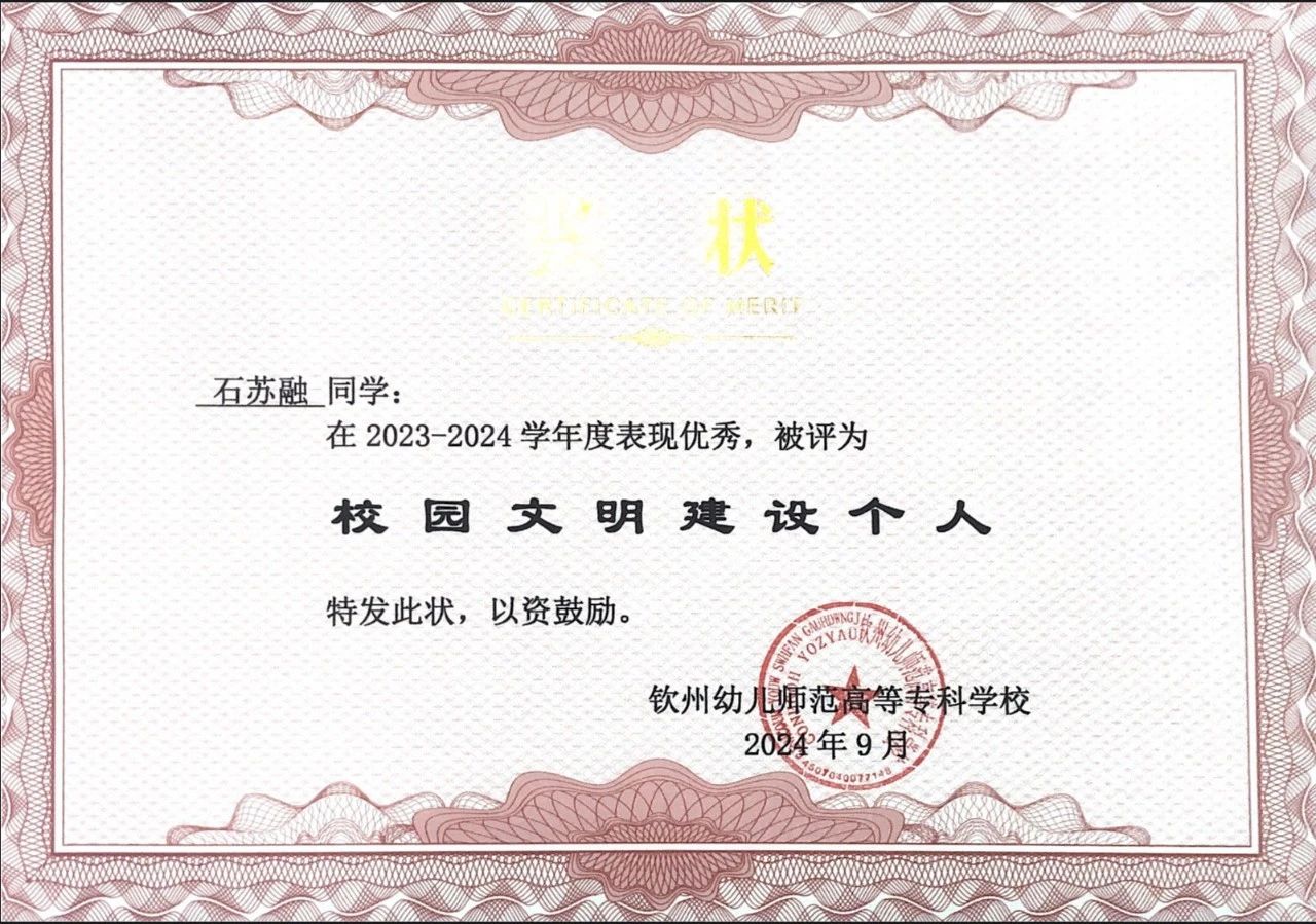 石苏融,共青团员,儿童早期发展学院婴幼儿托育服务与管理专业23级01班学生。现任学院团学会青年志愿者工作部副部长,在大学期间曾荣获国家励志奖学金、校级三等奖学金、校园文明建设先进个人、校级劳动实践先进个人、劳动积极分子、专业基本功(婴幼儿玩教具)大赛组一等奖、专业基本功(绘本故事展演)大赛组三等奖等荣誉。