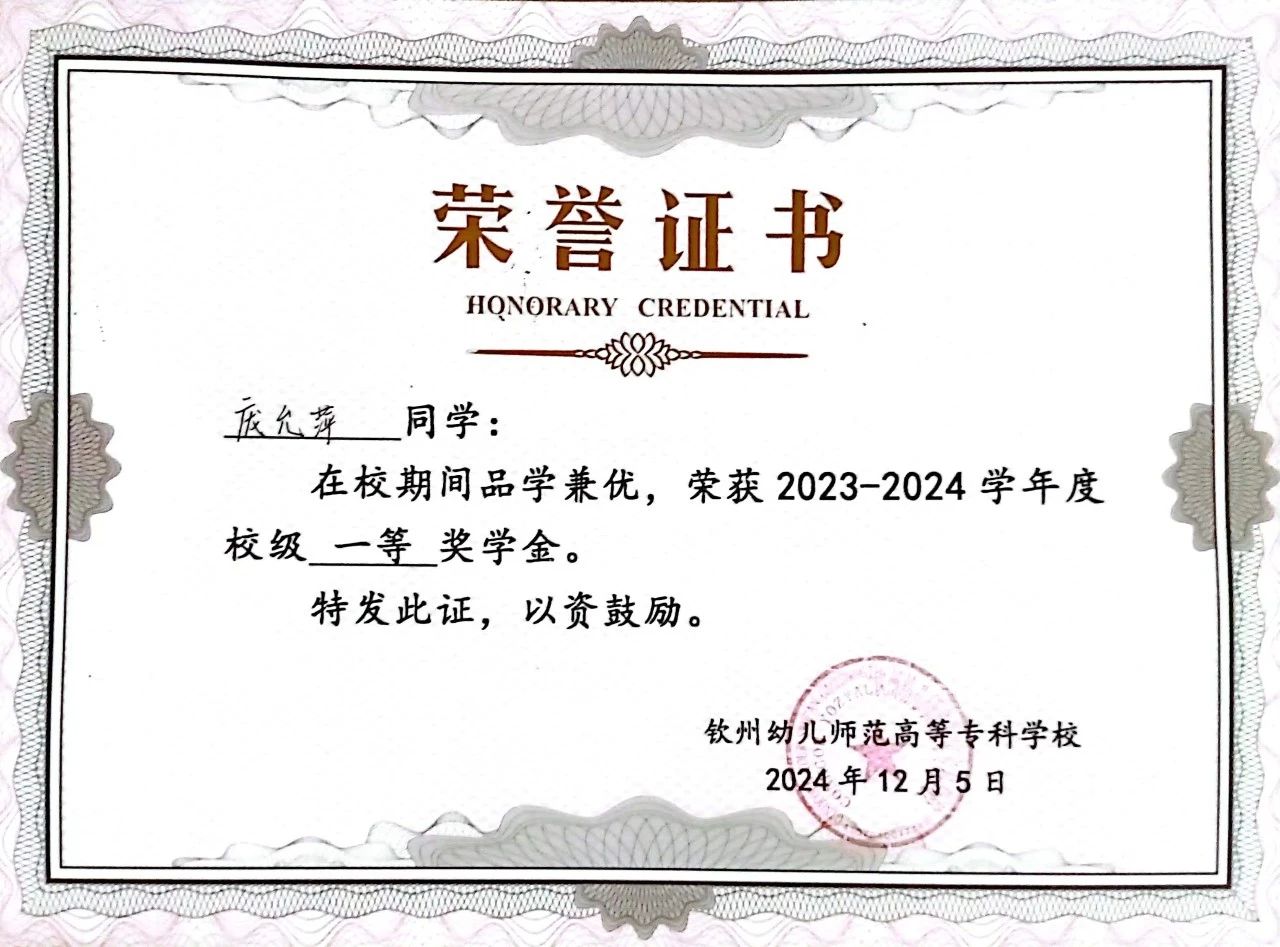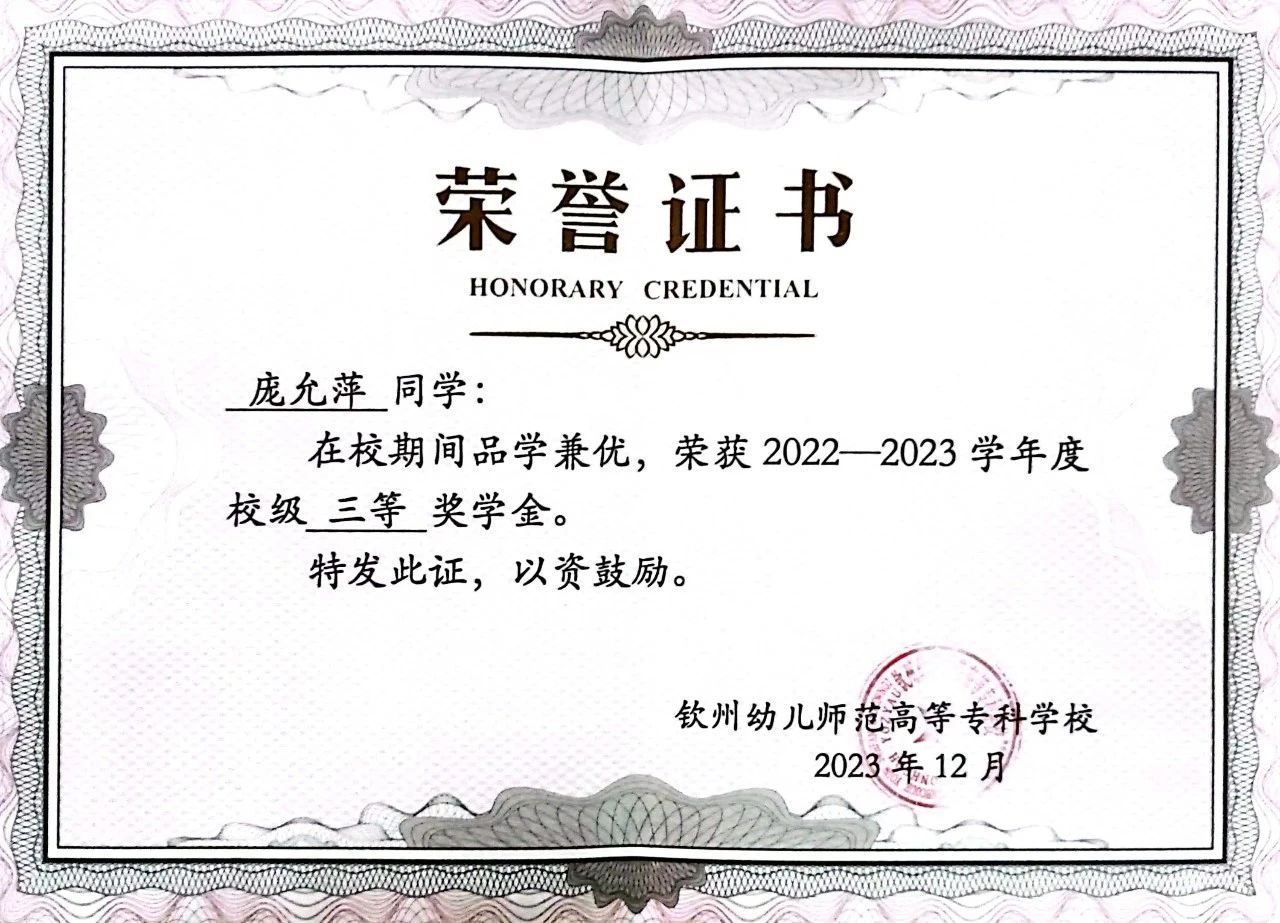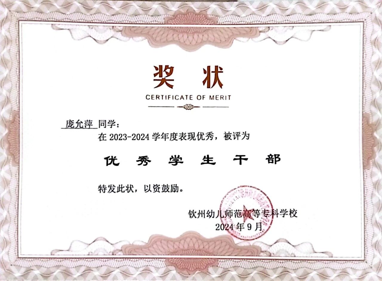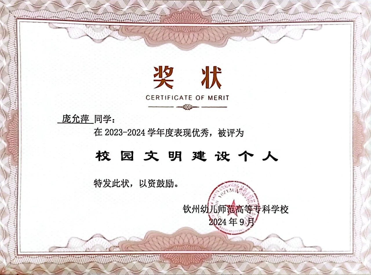 庞允萍,中共预备党员,儿童早期发展学院婴幼儿托育服务与管理专业22级04班学生。在校期间,担任班级心理委员,荣获2022-2023年度国家励志奖学金、2023-2024年度国家励志奖学金、校级三等奖学金、校级一等奖学金、优秀共青团员、优秀青年志愿者、优秀学生干部、校园文明建设个人、三好学生、最美钦幼学子、劳动实践先进个人、专业基本功比赛三等奖等荣誉。