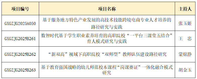 近日,自治区教育厅公布了2025年度广西职业教育教学改革研究项目名单,我校教师喜获重点项目1项和一般项目3项。以下为立项名单: