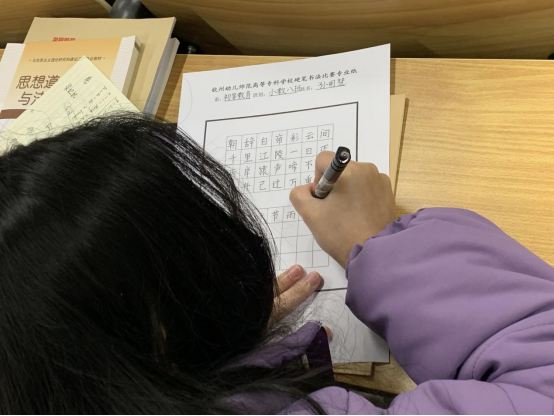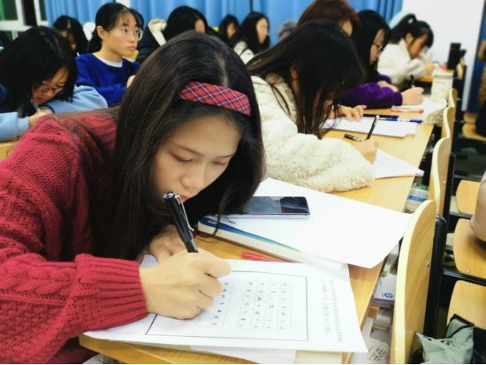 为了弘扬中华民族优秀传统文化,丰富校园文化生活,提升当代大学生的文化修养和审美情趣,培养学生对书法的兴趣,提高学生的汉字书写水平,12月20日晚上7:30--8:00,初等教育系举行全系学生硬笔书法比赛。