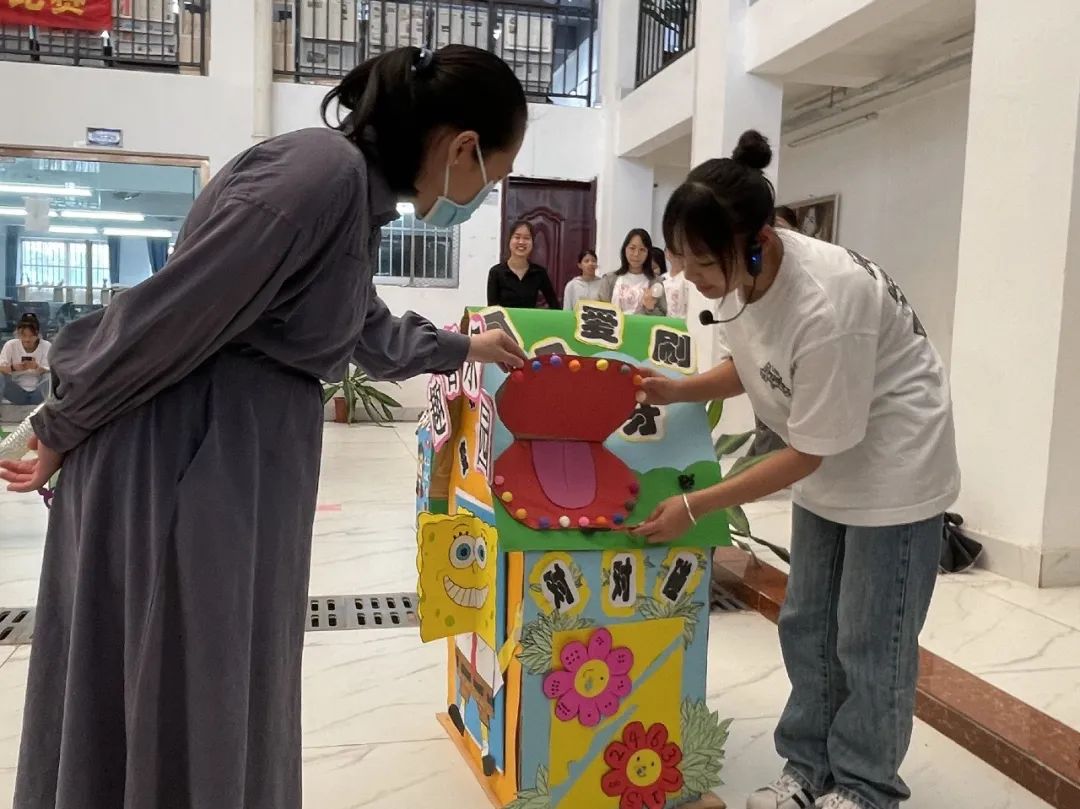 比赛中,选手们按班级顺序展示自己的作品,分别从作品名称、设计目的、使用材料、使用功能、教育价值等方面详细解说自制的幼儿园玩教具,并进行现场操作示范。从材料上看,大部分同学选择了低结构废旧材料,不仅符合当前的环保理念,也方便收集,一个个纸壳箱、矿泉水瓶盖、泡沫板、光碟、纸盘等经过同学们的“奇思、巧手”变成了孩子们爱不释手的玩具。其中作品《奇妙的声音之旅》使用各种生活常见的器具为主要元素,通过击打、摇晃可以制造出各种不同的声音;《皮影小剧场》创意十足,薄透的幕布背后充满神秘感,展示了传统文化的魅力;《奇幻妙妙》是一个手工售卖屋造型,富有新意,功能多样,可以让幼儿通过角色扮演体验生活;《过年啦》以中国传统文化春节的元素为主、巧妙的与国歌的介绍、各类益智游戏结合展示,突出了玩教具的思政价值......各组参赛玩教具构思巧妙、造型新颖,给在场的师生留下了深刻印象。