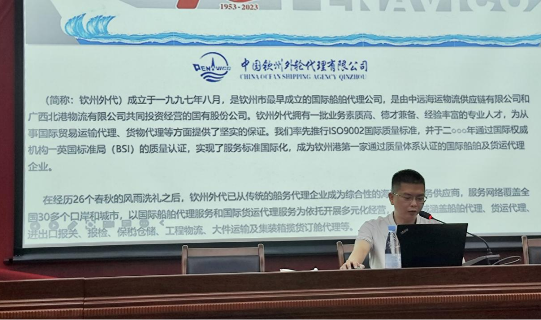 为全面提高学生素质与专业能力,打造面向未来的新时代新青年,近日,公共管理系在东报告厅举办题为“国际船舶货运代理知识和岗位认知”讲座。本次讲座邀请了中国钦州外轮代理有限公司党支部书记莫锦幸现场授课。2021级和2022级应用英语专业全体学生现场聆听此次讲座。