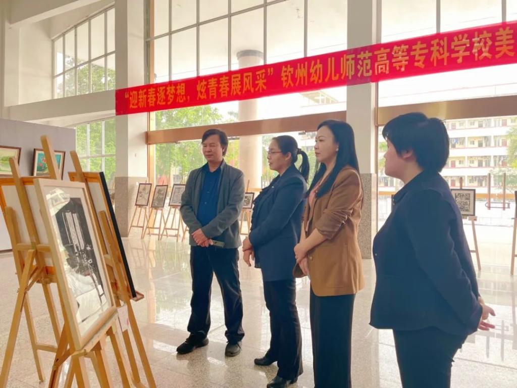 Δ校长卢红青(左2)、副校长邓秋晓(左3)观摩学生作品