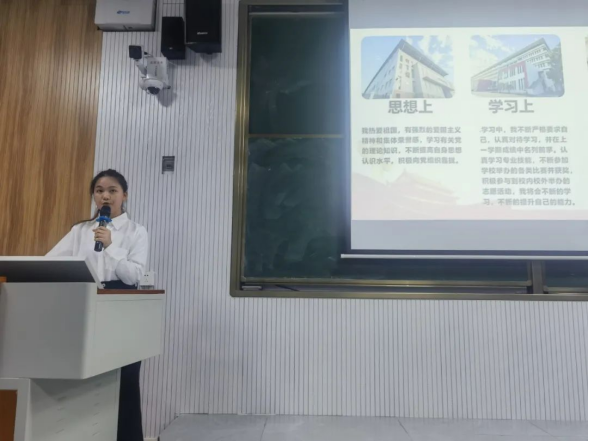 2021级行政管理专业2班的张露予同学从“思想品德——坚定信念、坚守初心”“专业学习——博学强知、奋斗不息”“学生活动——学以致用、知行并进”等三个方面分享了她的大学成长历程。她建议同学们在思想上要积极向党组织靠拢,争取早日加入中国共产党;学习上要惜时奋进,努力学好专业知识,提高专业技能水平;实践上要能吃苦、肯付出、勤奉献,锻炼自我、挑战自我;生活中要学会感恩,不忘求学路上得到的帮助,知恩感恩,勇敢追梦,回报社会。