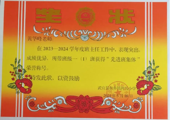 在他的努力下,他所带的班班风正、学风浓,班级的各项活动和教学成果始终名列年级前茅,得到了学生和校领导的一致好评。今年5月,他所带的班级一(1)班被评为学校“先进班集体”。