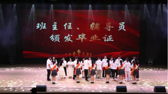 随后,在区优秀毕业生表彰和颁发毕业证环节,卢红青校长为荣获自治区优秀毕业生荣誉的毕业生代表颁发了证书。2021级全体班主任、辅导员为毕业生代表颁发了毕业证书。