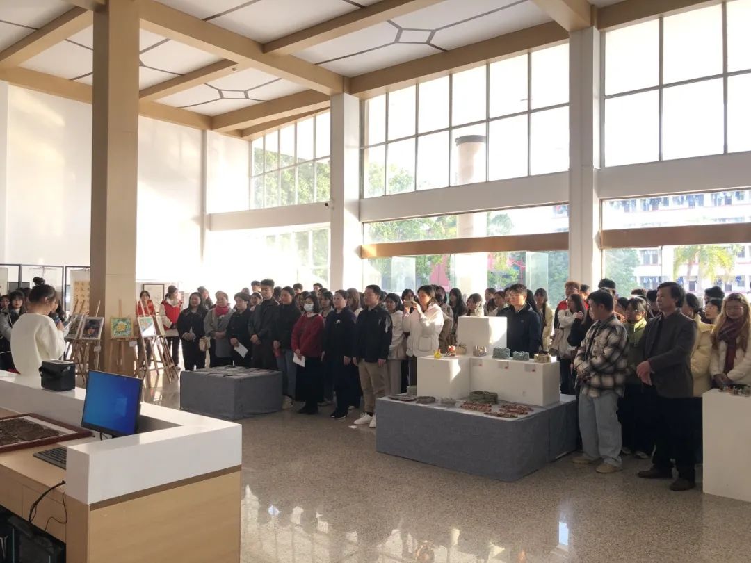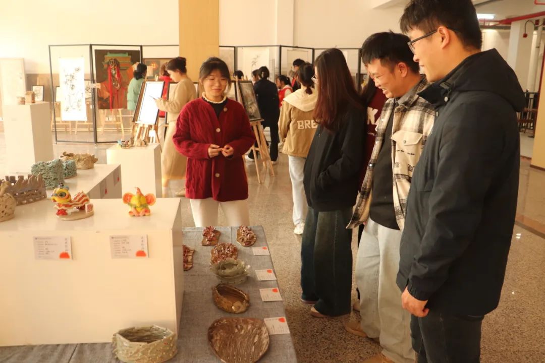 近日,体育与艺术学院在校图书馆一楼展厅举行2024年秋季学期美术作品展开幕式,美术教育、艺术设计专业团队指导老师和全体学生参加。本次活动,共有200多名学生报送美术、设计、陶艺、书法等类型的创作作品。经过选拔,共有100件作品入围本次作品展。本次作品展活动时间为2024年12月23日至2025年1月5日。