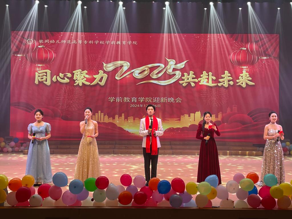 12月26日晚,学前教育学院2025年“同心聚力 共赴未来”迎新晚会在艺术楼报告厅隆重举行。学校党委书记卢红青,党委副书记、校长陈鹏,市教育局党组成员、副局长苏俭,学校副校长颜循泽、杨秋宇,学前教育学院院长梁艳珍,钦州幼专童悦幼教集团总负责人陈小杰,市内30多所幼儿园园长等领导嘉宾莅临晚会现场,与学院全体教师、23级、24级在校学生欢聚一堂,共同迎接2025年的到来。
