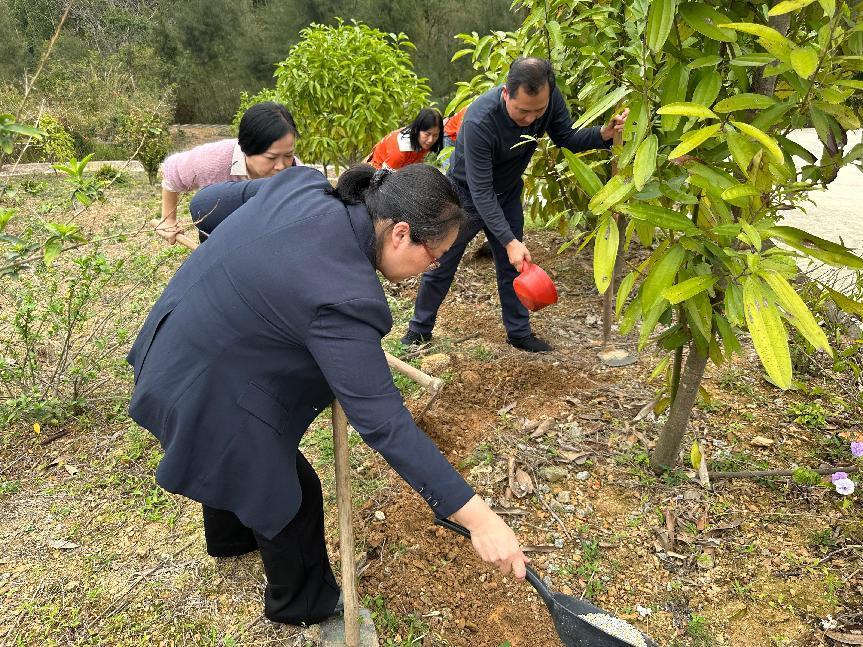 在春日的芳华林,党旗尤其鲜艳。学校党委书记卢红青率先挥锹,带领教职工完成树苗的除草与施肥。教职工挥汗植树的背影、劳动中绽放的笑颜,构成师者与春天的生动写真。