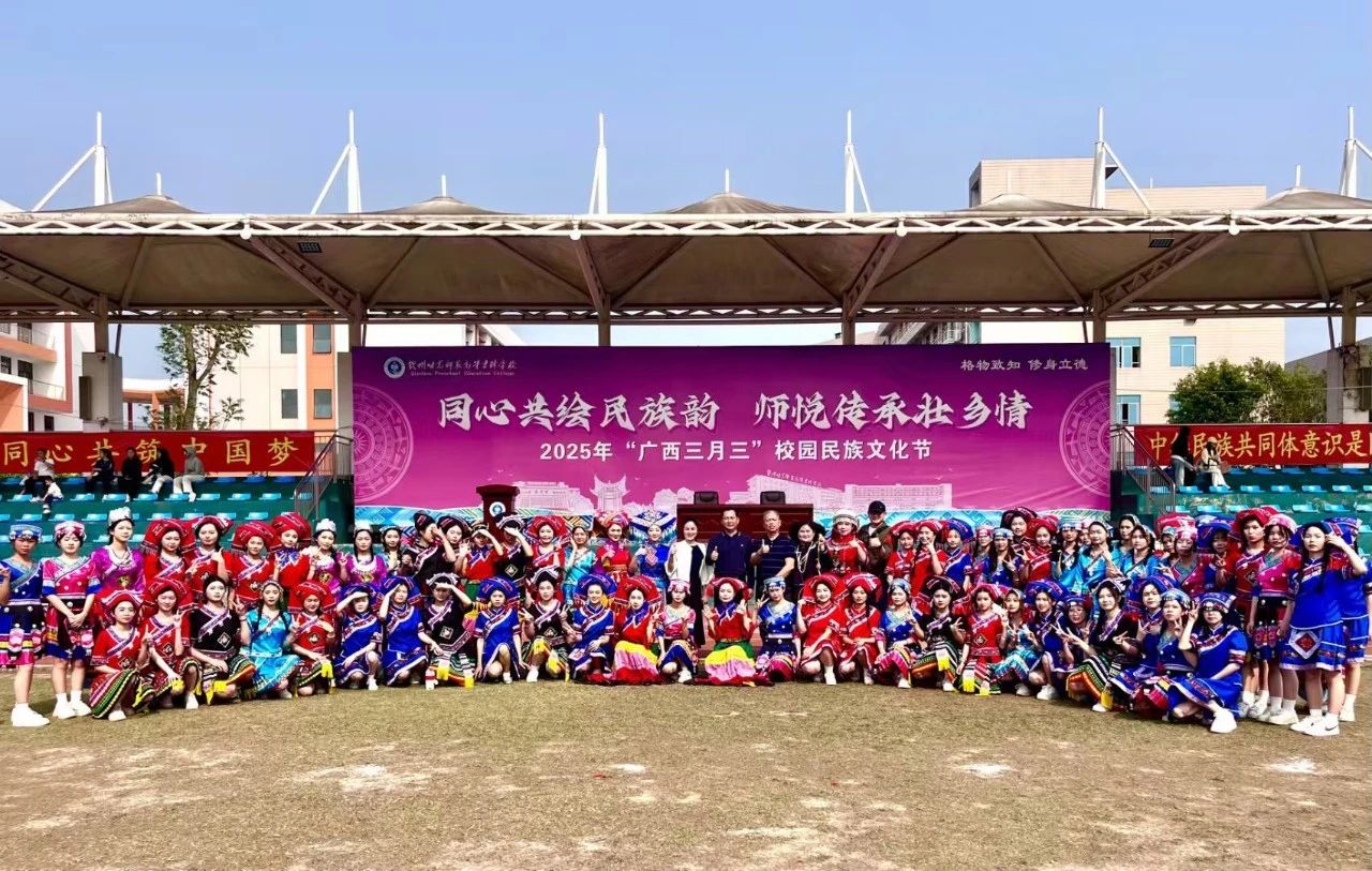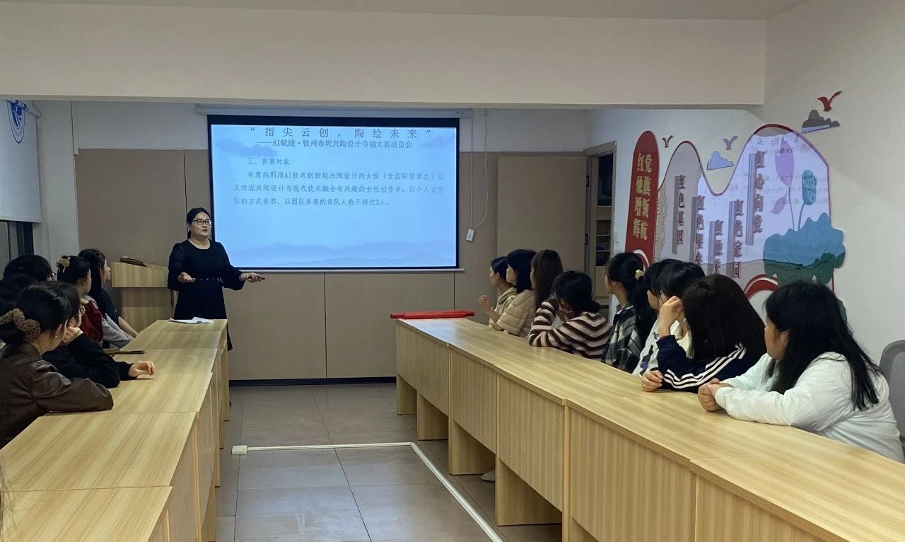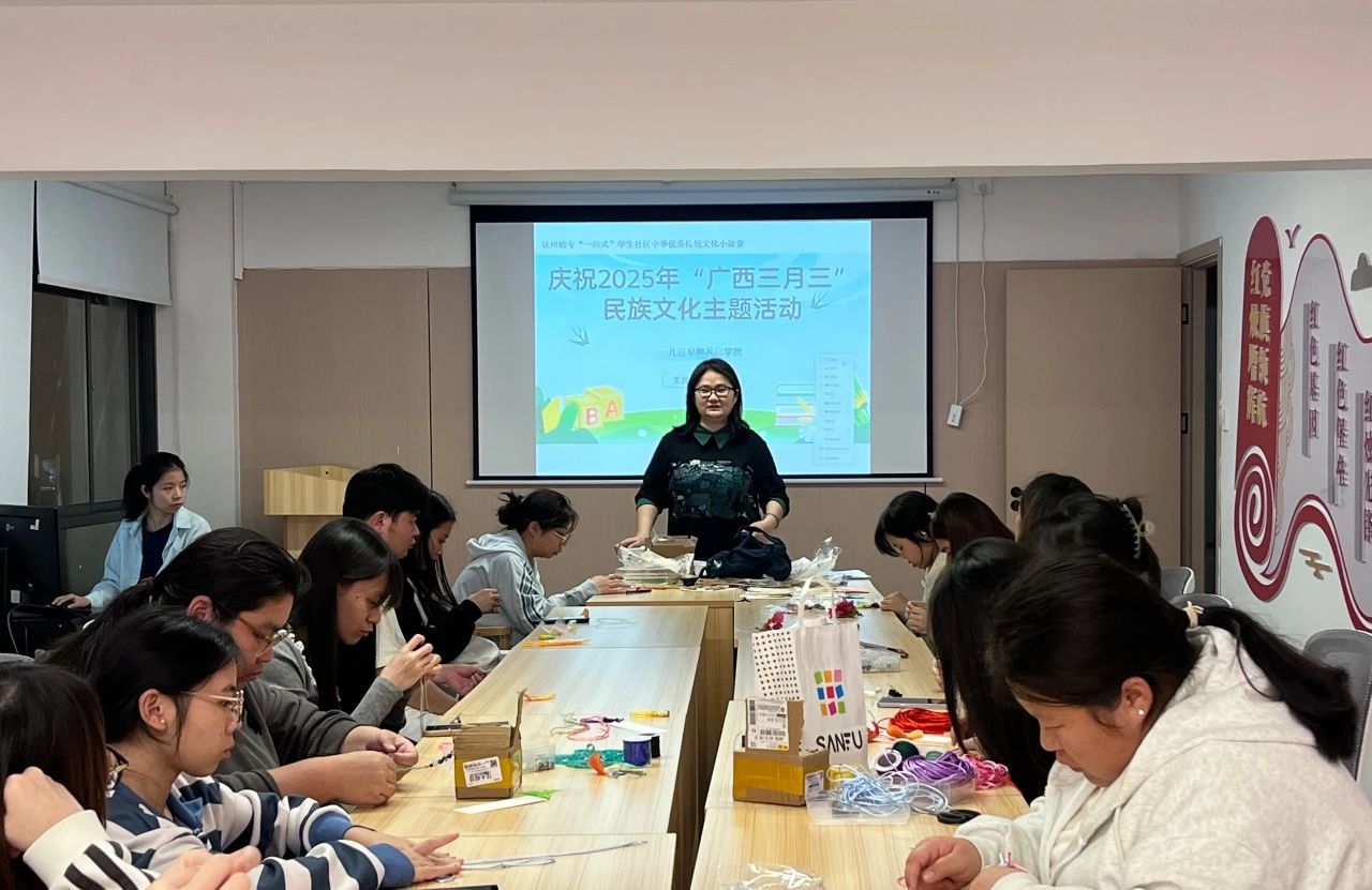 在一站式学生社区举办的民族文化活动中,师生通过聆听“指尖云创 陶绘未来——AI赋能·钦州市坭兴陶设计巾帼大赛”培训讲座,同心编织非遗手工等沉浸式体验,用“AI+非遗”赋能职业技艺和文化自信提升?;疃采?,全体齐唱《爱我中华》,许下“同心共筑中国梦”的庄严承诺,以文化交融为纽带,激发民族团结新活力。