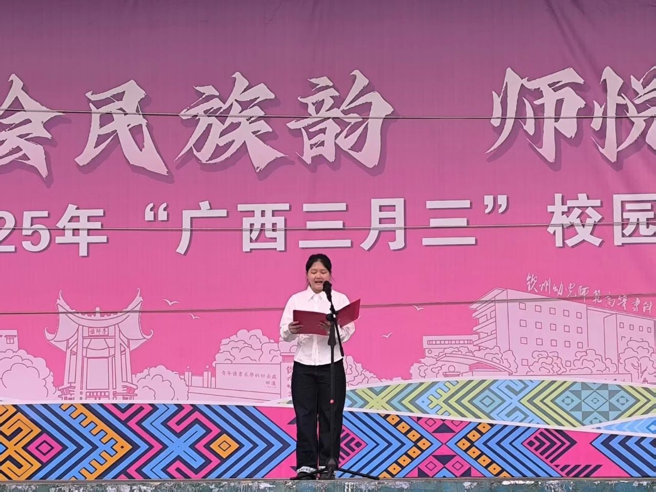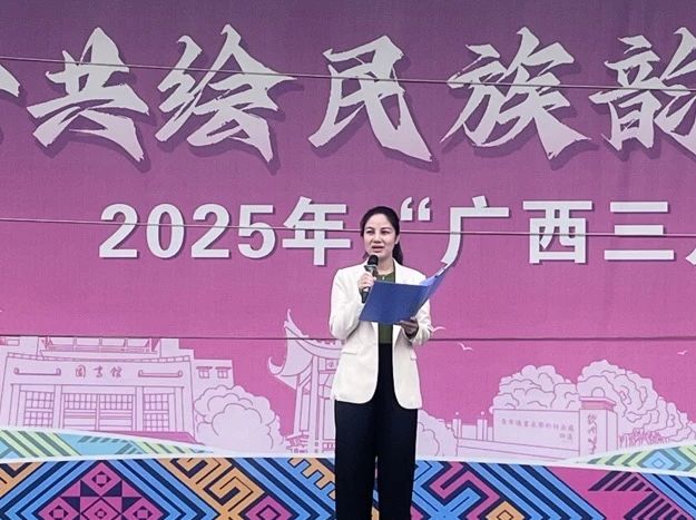 在庄严的升旗仪式上,学院2023级杨安丽同学以《同心共筑石榴情 携手同歌三月三》为题发表演讲,从“石榴花”“团结曲”“奋斗路”三个维度,呼吁青年学子争做民族团结的践行者与捍卫者。唐书群院长通过国旗下的讲话号召全体师生积极参与到庆祝2025年“广西三月三”民族文化主题活动中,以沉浸式教育深化师生爱国情怀。