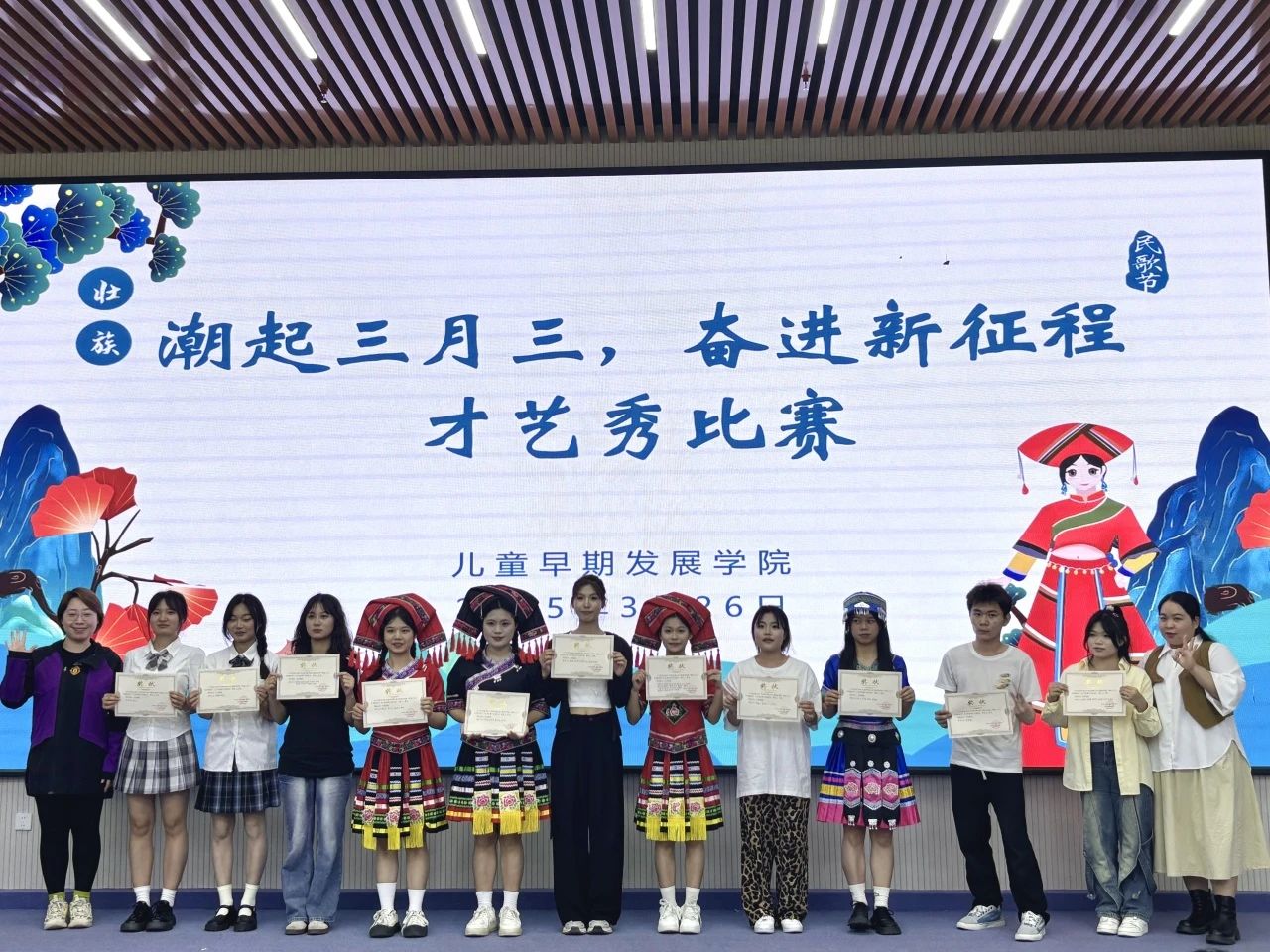 为深入弘扬“广西三月三”民族文化,铸牢中华民族共同体意识,儿童早期发展学院以“民族团结”为主线,于2025年3月开展系列主题活动,通过才艺展演、文化体验、主题班会及爱国教育等形式,展现青年学子传承民族文化、共筑团结篇章的青春担当。