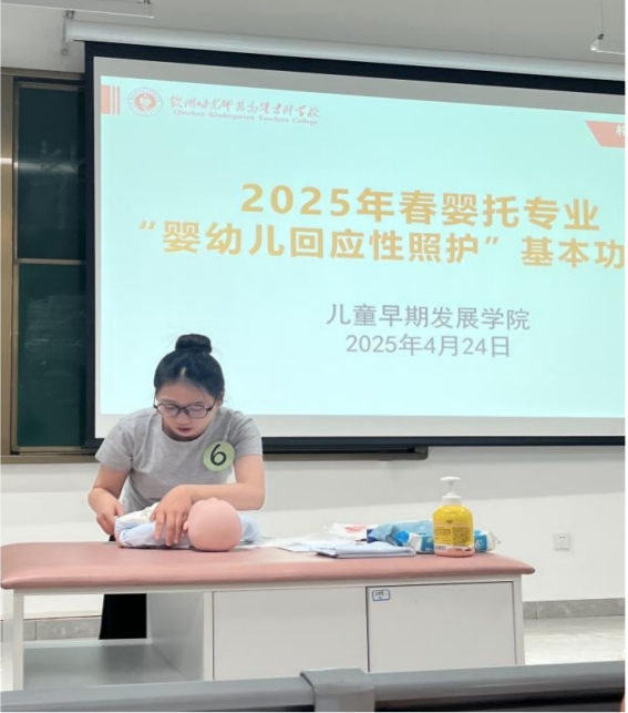 为深化婴幼儿托育服务与管理专业学生的实践能力培养,推动“岗课赛证”融通育人模式落地见效,近日,儿童早期发展学院在综合楼417教室举办2025年春季学期“婴幼儿回应性照护”技能大赛决赛。本次大赛围绕“以儿童为中心”的核心理念,通过“以赛促学、以赛促练”的实践路径,全方位锤炼学生的职业素养与技能水平。