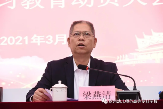 梁燕清校长在会上组织带领参会人员学习了习近平总书记在党史学习教育动员大会上的重要讲话精神和自治区党委鹿心社书记在全区党史学习教育动员大会上的讲话精神并指出,一是根据田书记的部署,快速成立领导小组,做方案、明职责、重实施,掀起学习教育的高潮。二是各处室、系部要立即制定党史学习教育计划,要认真学习,知行合一,突出亮点特色,确保学习成效。三是各处室和系部规定动作要到位,自选动作要创新,把学习与立德树人,学习与专业教学、学习与劳动教育、体育教育、美育教育相结合,使自己成为好老师,培养一批又一批好老师。