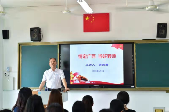 发布日期:2021年07月01日?盛夏六月,风醇清香。6月份,学校梁燕清校长、李飞副书记、颜循泽副校长、陆汉川副校长、黄兴主席等校级领导先后走上讲台,为学生讲授思想政治理论课。这一期思想政治理论课,各位领导围绕“情定广西,当好老师” 、“决战决胜,攻克贫困堡垒”、“消除贫困,改善民生,共同富裕”等主题,以讲党史...