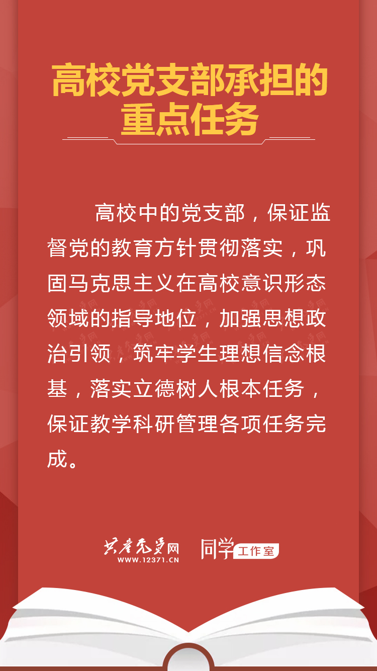 发布日期:2020年07月09日【高校党支部承担的重点任务】 高校中的党支部,保证监督党的教育方针贯彻落实,巩固马克思主义在高校意识形态领域的指导地位,加强思想政治引领,筑牢学生理想信念根基,落实立德树人根本任务,保证教学科研管理各项任务完成?! ⊙由煸亩痢 吨泄膊持Р抗ぷ魈趵ㄊ孕校啡摹 ?..